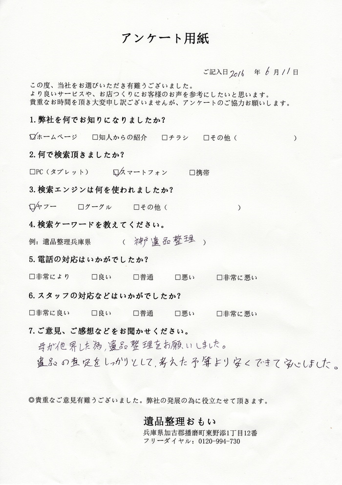 この度、遺品整理「おもい」をご利用有難うございます。